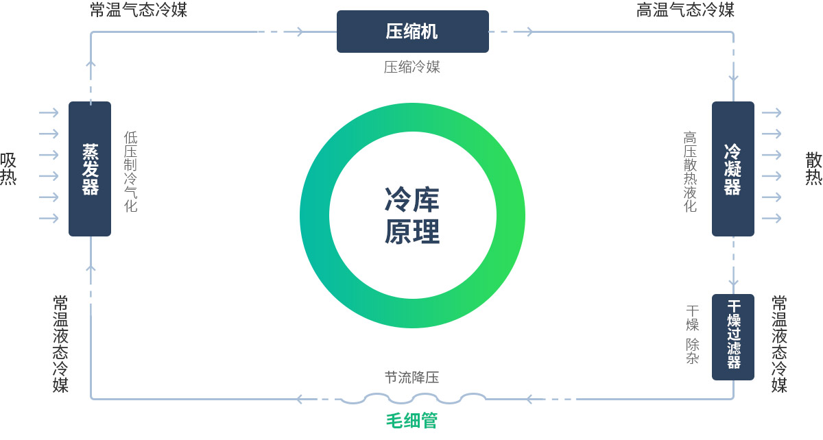 通過從冷庫庫房內(nèi)蒸發(fā)器即排管或冷風(fēng)機吸熱,然后使在室外的冷凝器排放熱量。通過壓縮機做功驅(qū)動不斷進行這樣一個